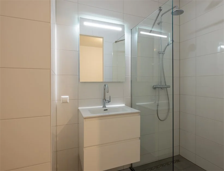 Vanuit de hal is er toegang tot alle vertrekken. In de gang bevindt zich een klein berghok waar wasmachine uitsluiting zit, daarnaast bevindt zich het toilet met fonteintje. De open keuken is voorzien...