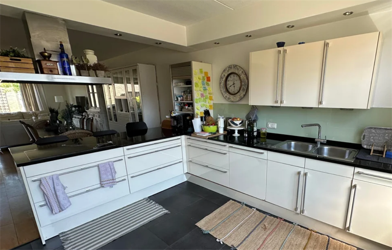 Entree welke toegang biedt tot het toilet, de woonkamer en de trap naar de eerste etage. De ruime woonkamer geeft toegang tot de open keuken aan de voorzijde. Deze luxe keuken beschikt over een induct...