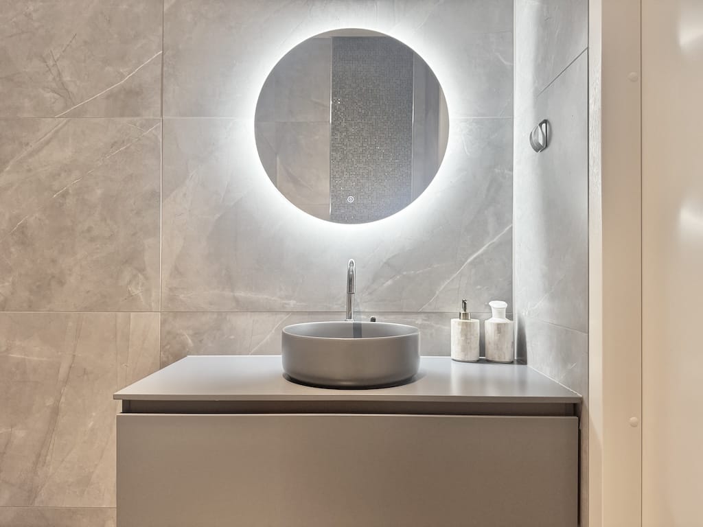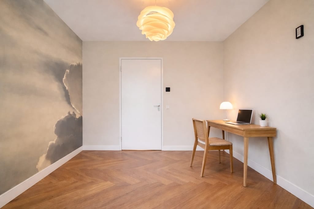 Fishbone wooden floor Ceiling lights Floor heating Floor cooling Curtains Rug TV [wall-mounted] L-shaped sofa Coffee table Access to balcony Kitchen island [4 barstools] Kitchen equipped with drawers ...