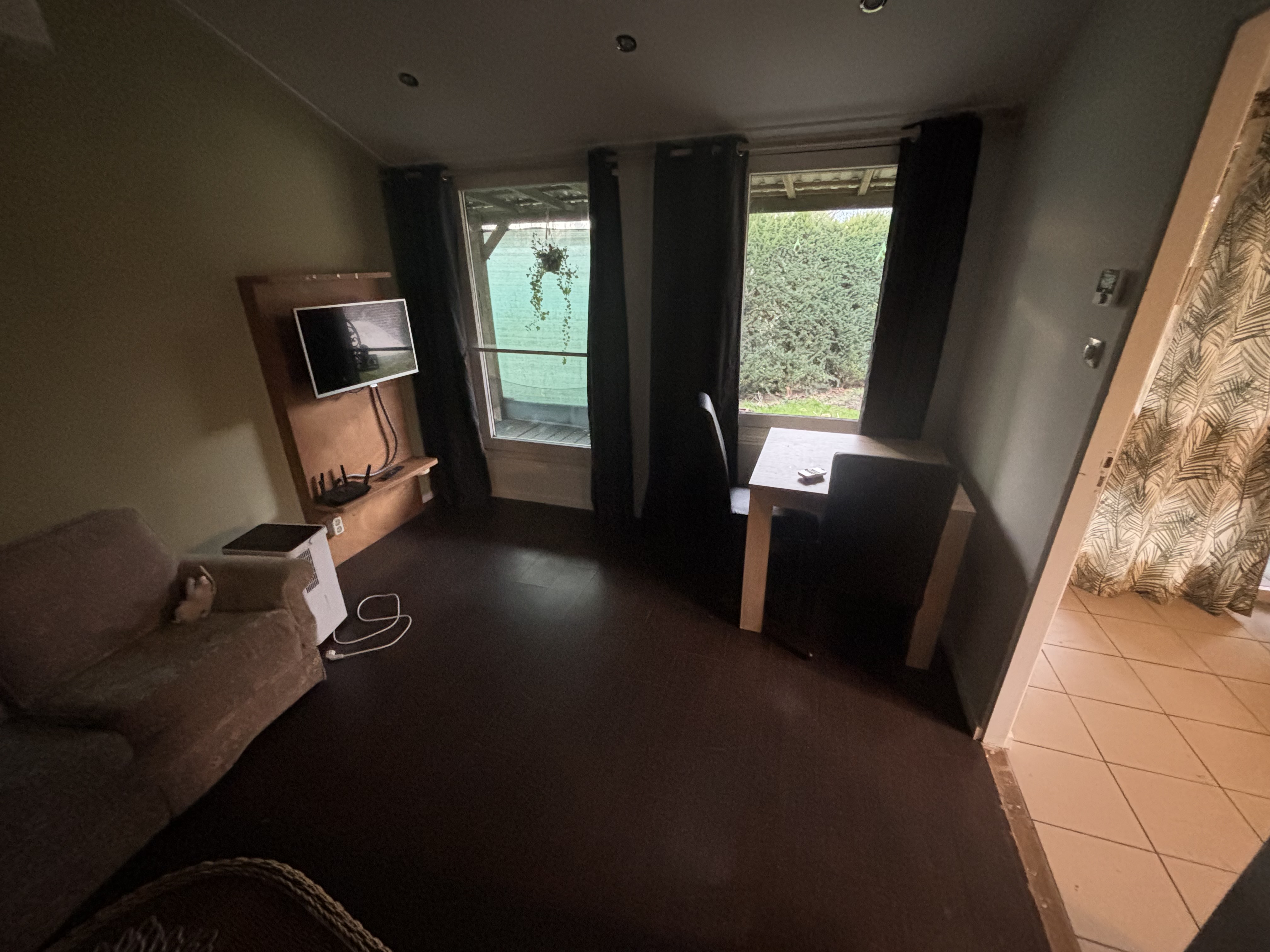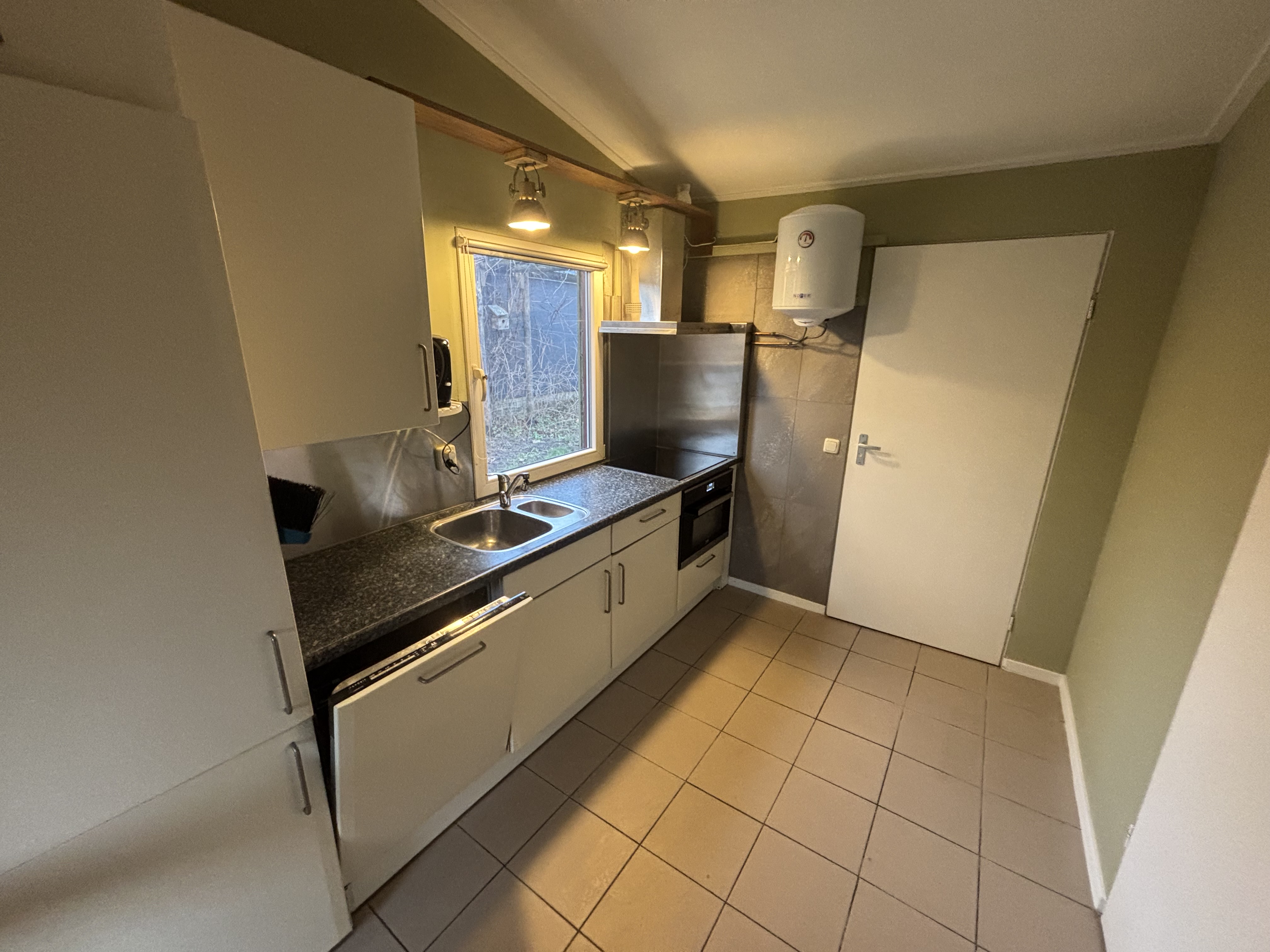knus huisje voorzien van alle gemakken: Airco vaatwasser koel en diepvrieskast infraroodverwarming wasmachine oven inductieplaat pannenset, serviesgoed gemeubileerd