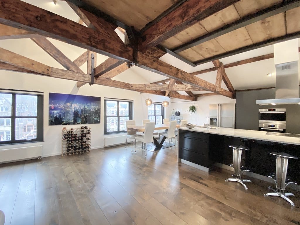 Tasteful fully furnished apartment of 110 ., with high ceilings (4,3 m) and exposed wooden beams located on the Rokin. The apartment is located on the 4th floor of a monumental building with an elevat...