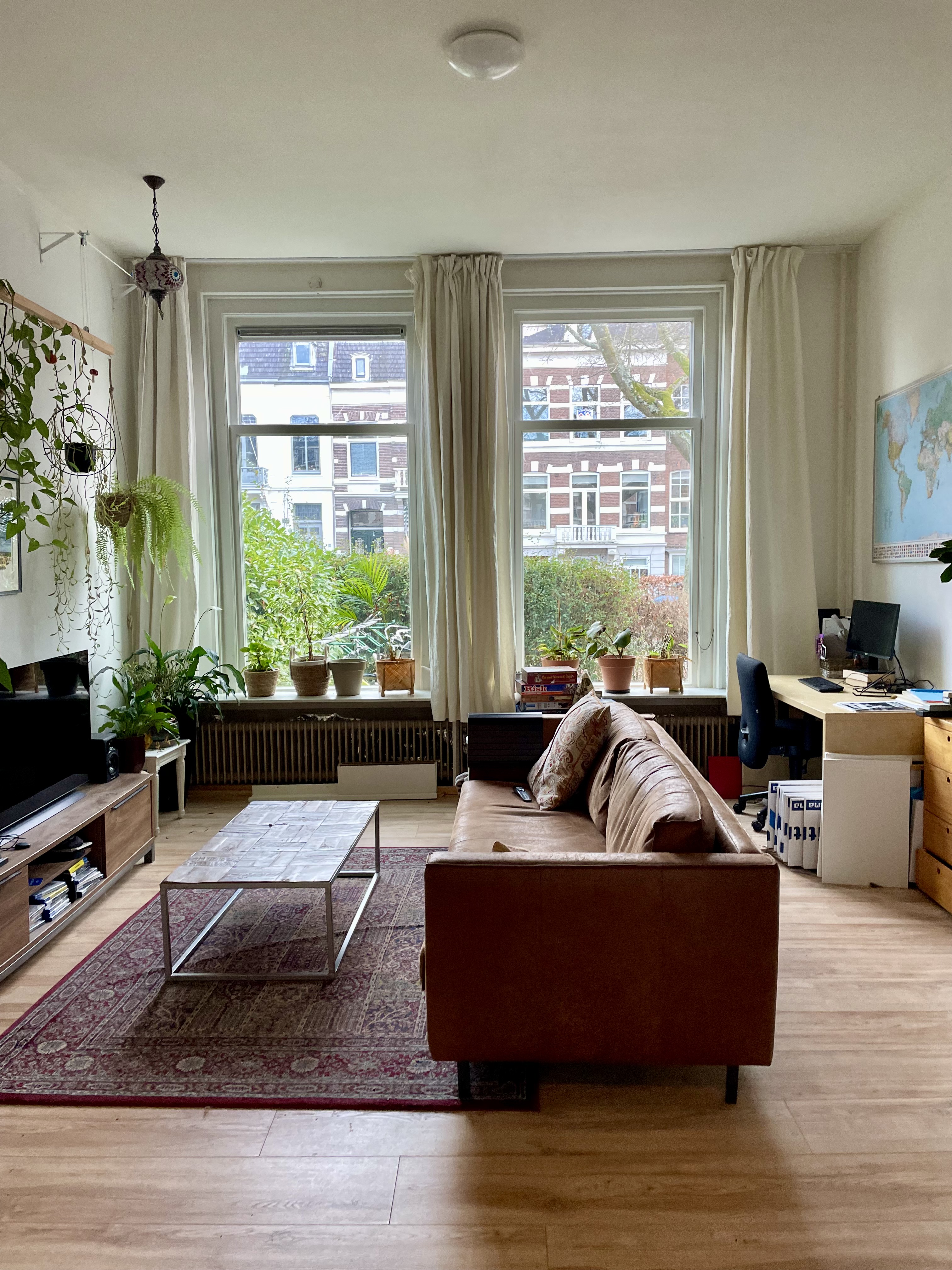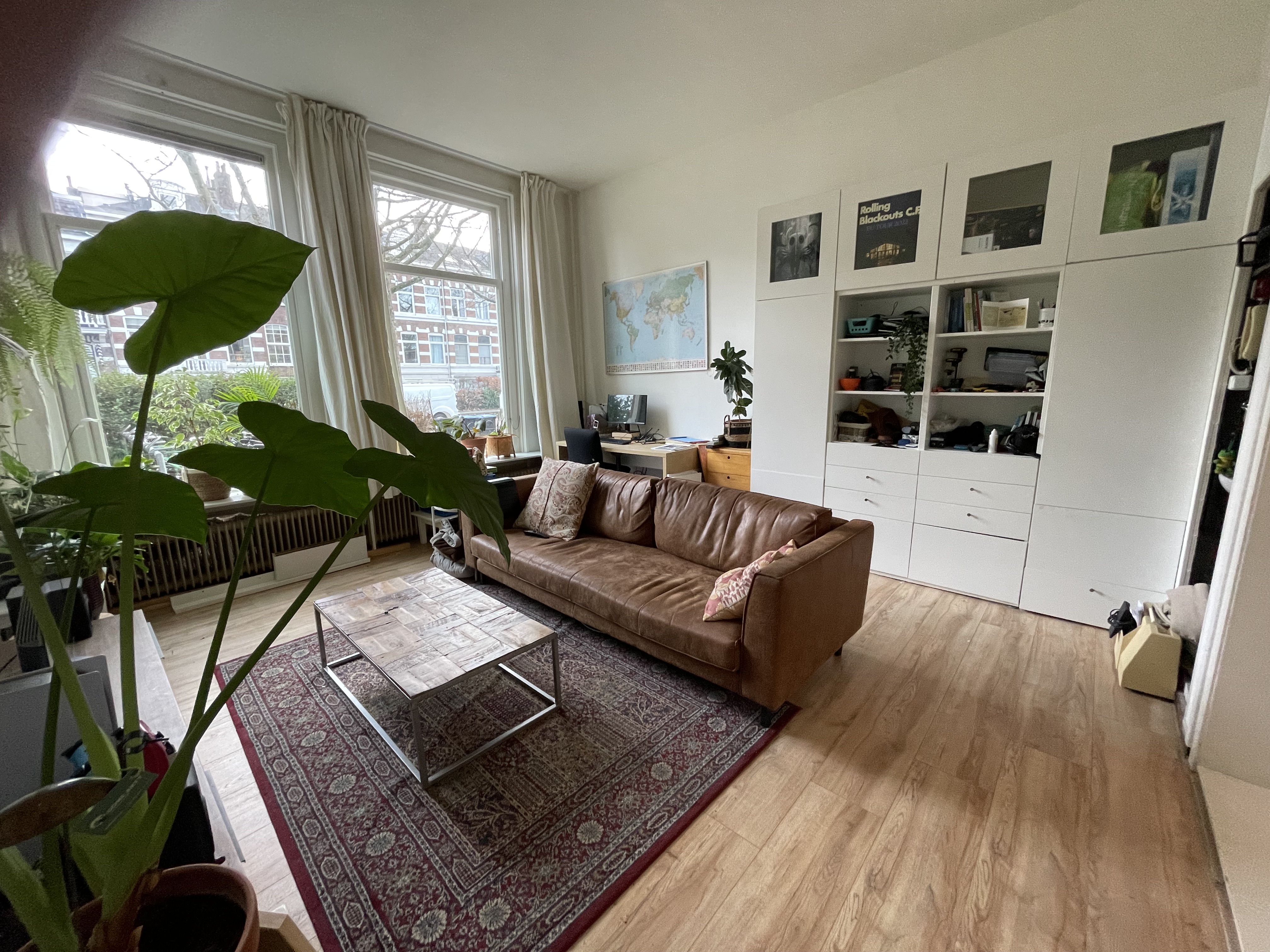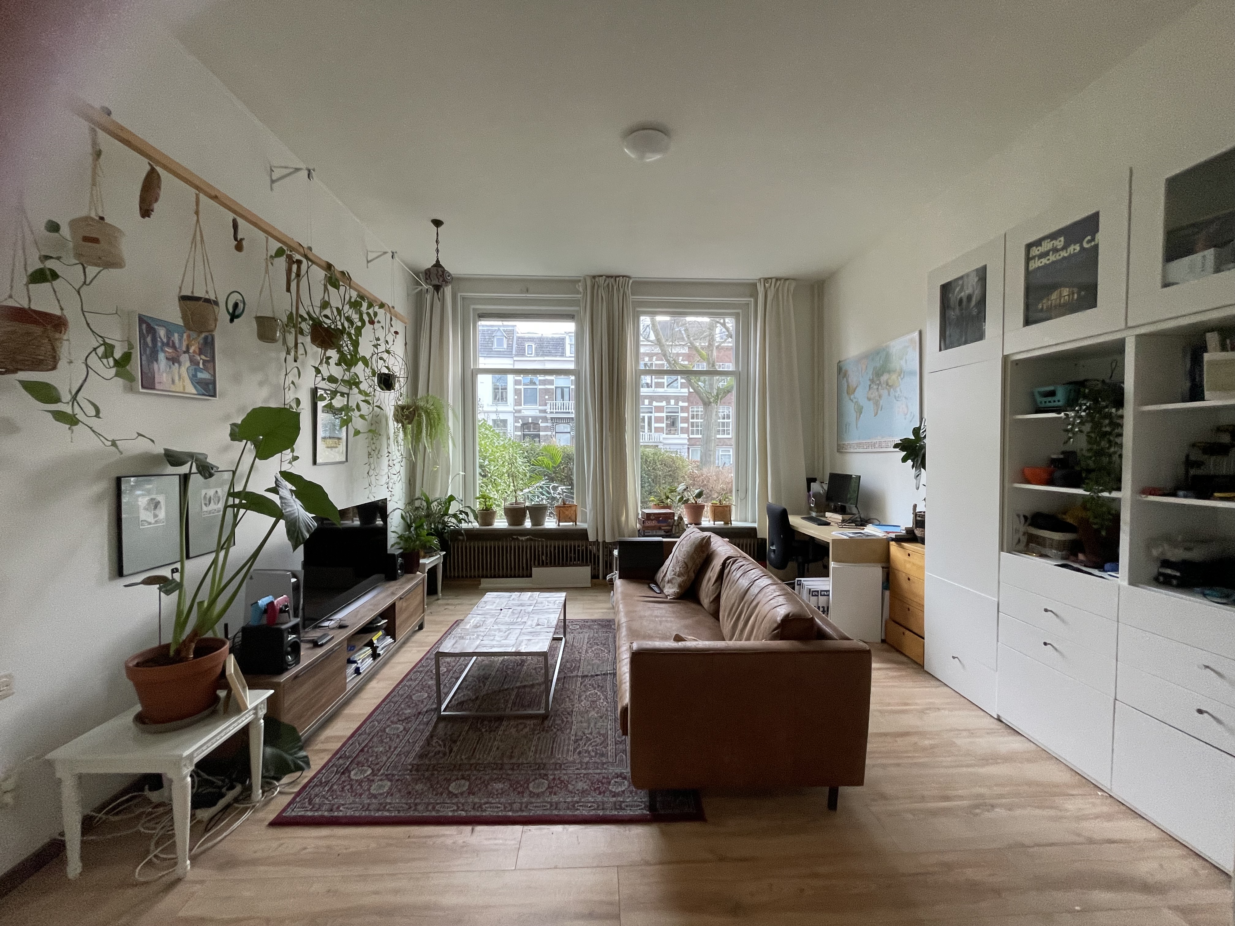 In prachtig herenhuis appartement op de begane grond met twee grote kamers, hoge plafonds en ramen. Verder slaapkamer met aangrenzend badkamer. Grote tuin met kastanjeboom