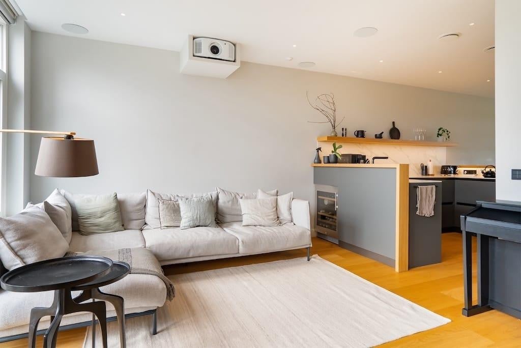 Beschrijving Volledig gemeubileerd ontwerp appartement aan de rustige Hoogte Kadijk met een privé dakterras, lichte woonruimte, luxe badkamer, home-cinema opstelling en een aparte kantoor-/gastenka...
