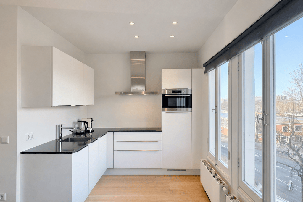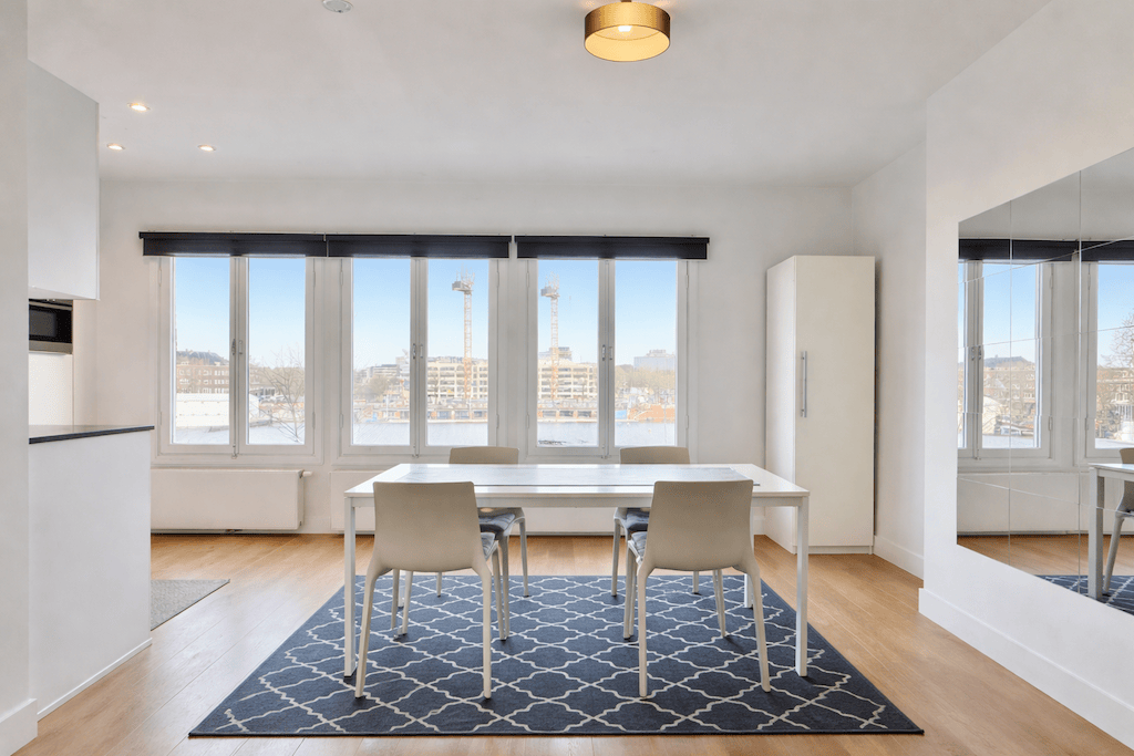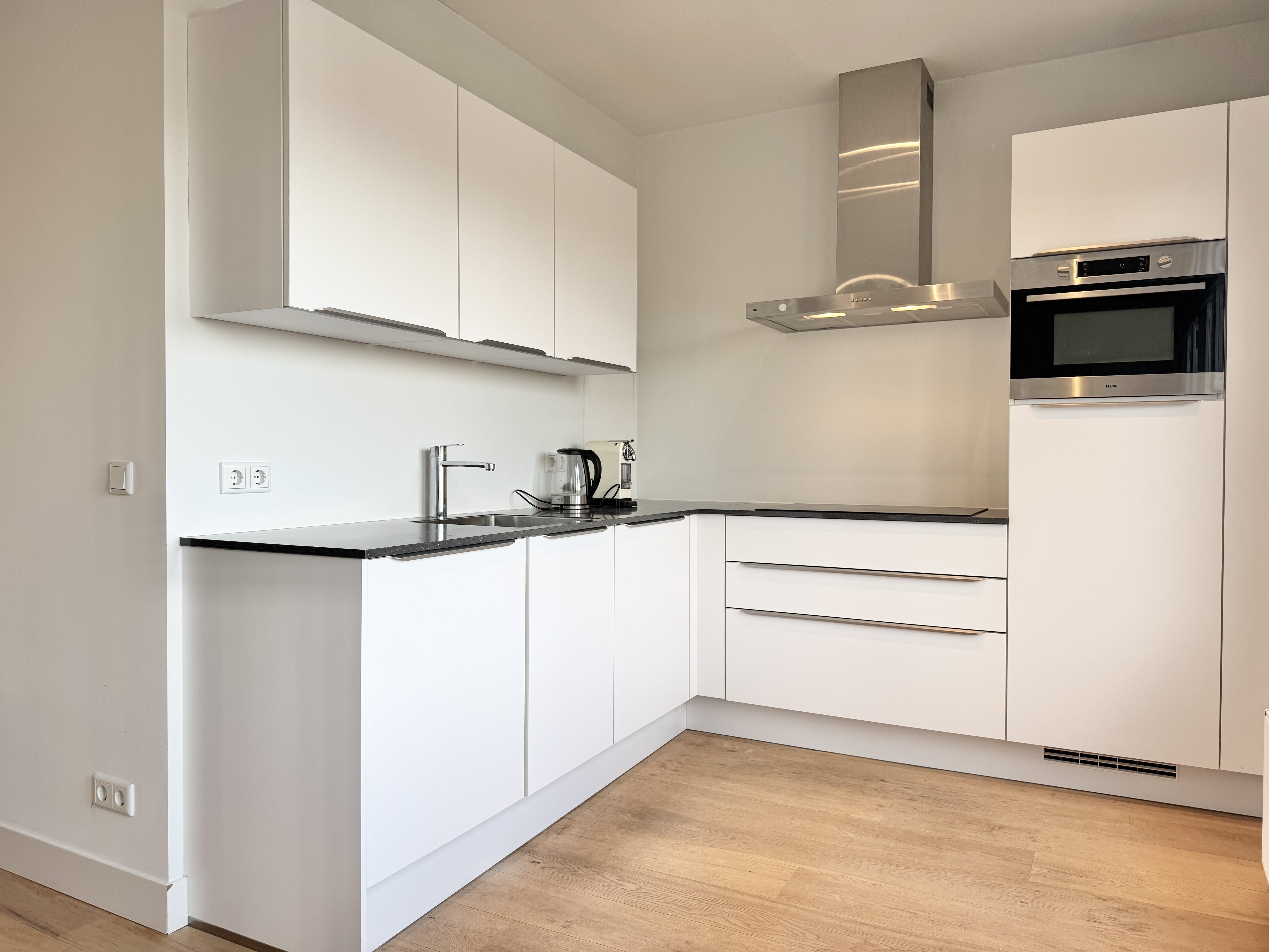 Wooden floor Central heating Ceiling lights Blinds Sofa Rug TV on TV stand Dinner table [4 chairs] Cabinet Kitchen equipped with drawers and cabinets Integrated 4 ring induction stove Integrated oven-...