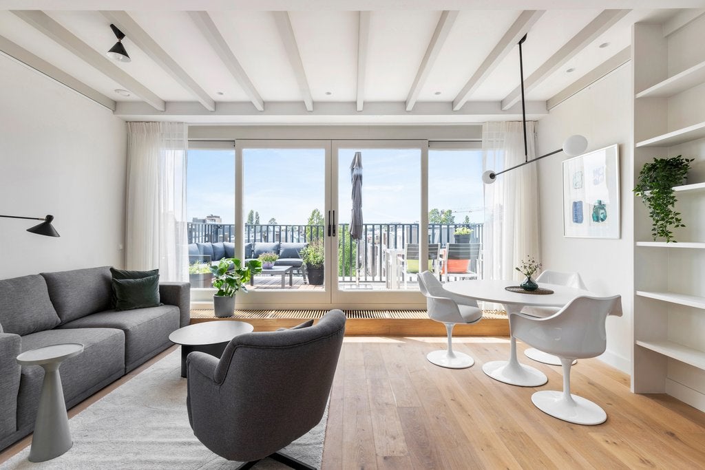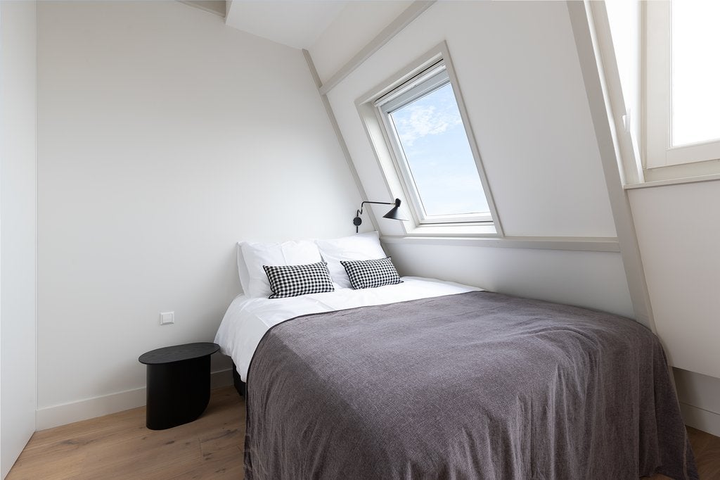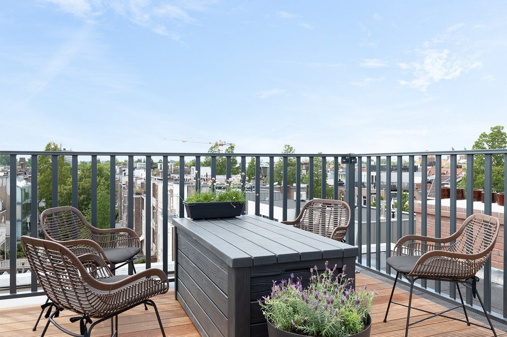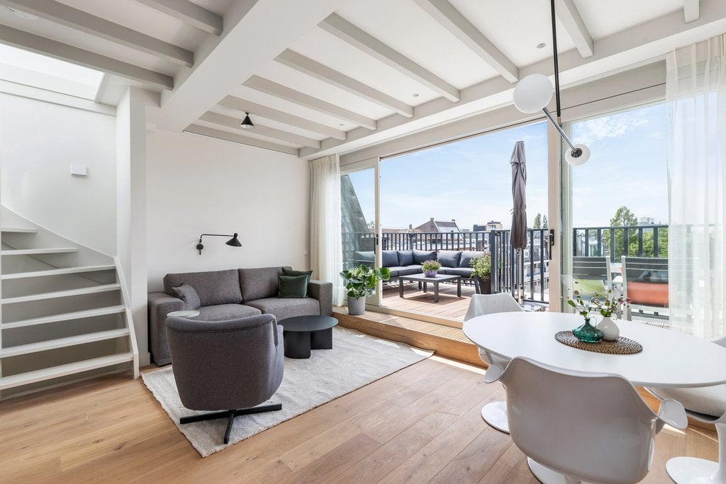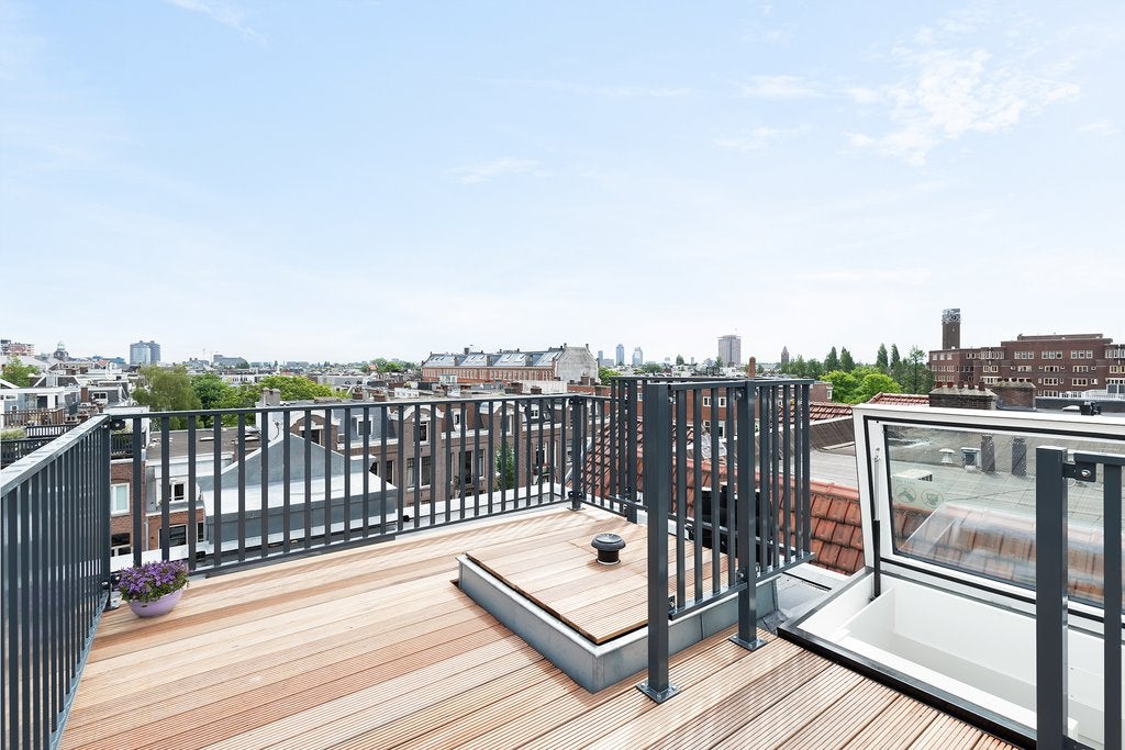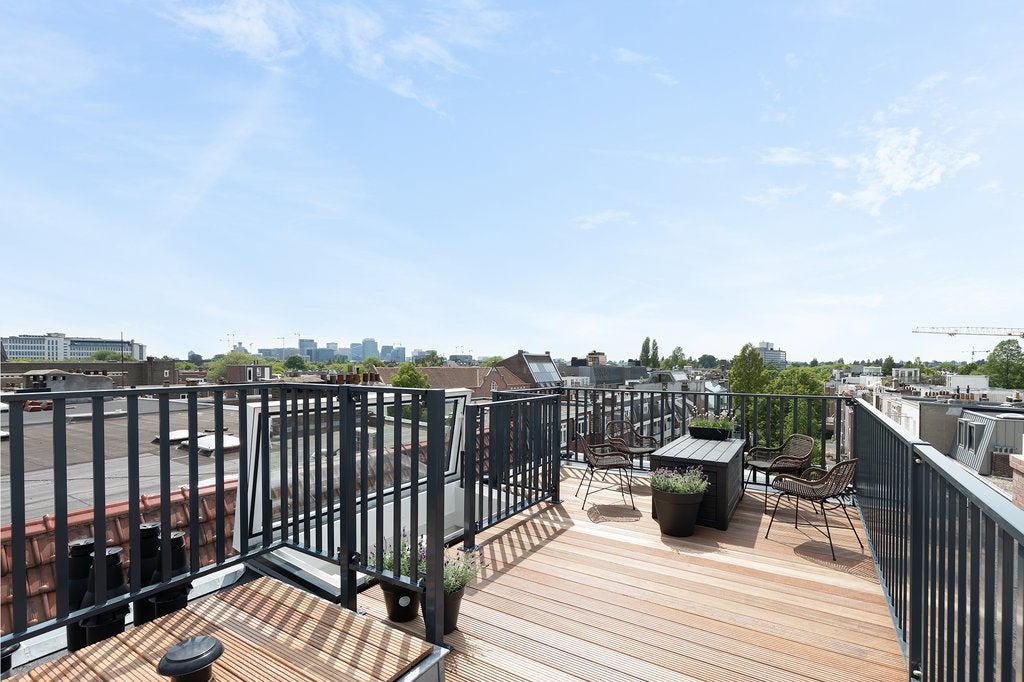 Beschrijving Fantastisch volledig gemeubileerd 2 slaapkamer appartement met lift direct in woning van ca. 65 m2, met 2 dakterrassen! Wauw! Dit appartement is gelegen op de vierde en bovenste etage...