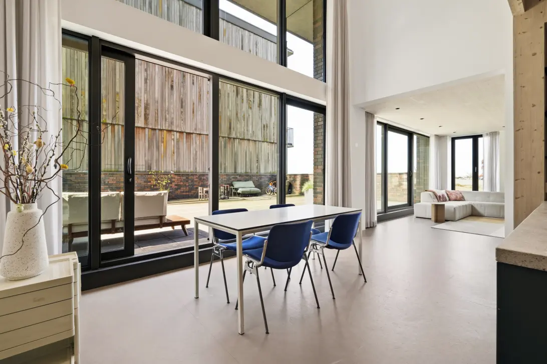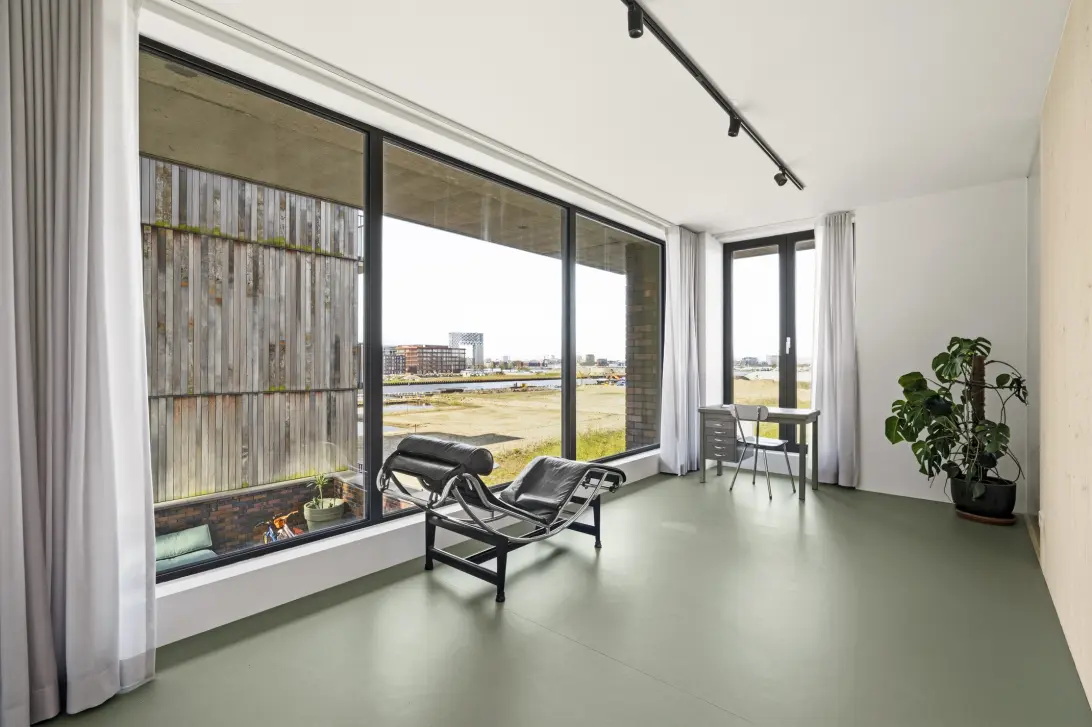 Unieke, zeer duurzame en lichte hoekwoning (150 m²) met loft-achtig karakter, hoge plafonds (5,3m²), privé parkeerplaats en een spectaculair dakterras (ca. 96 m²) op het zuiden met uitzicht over het I...