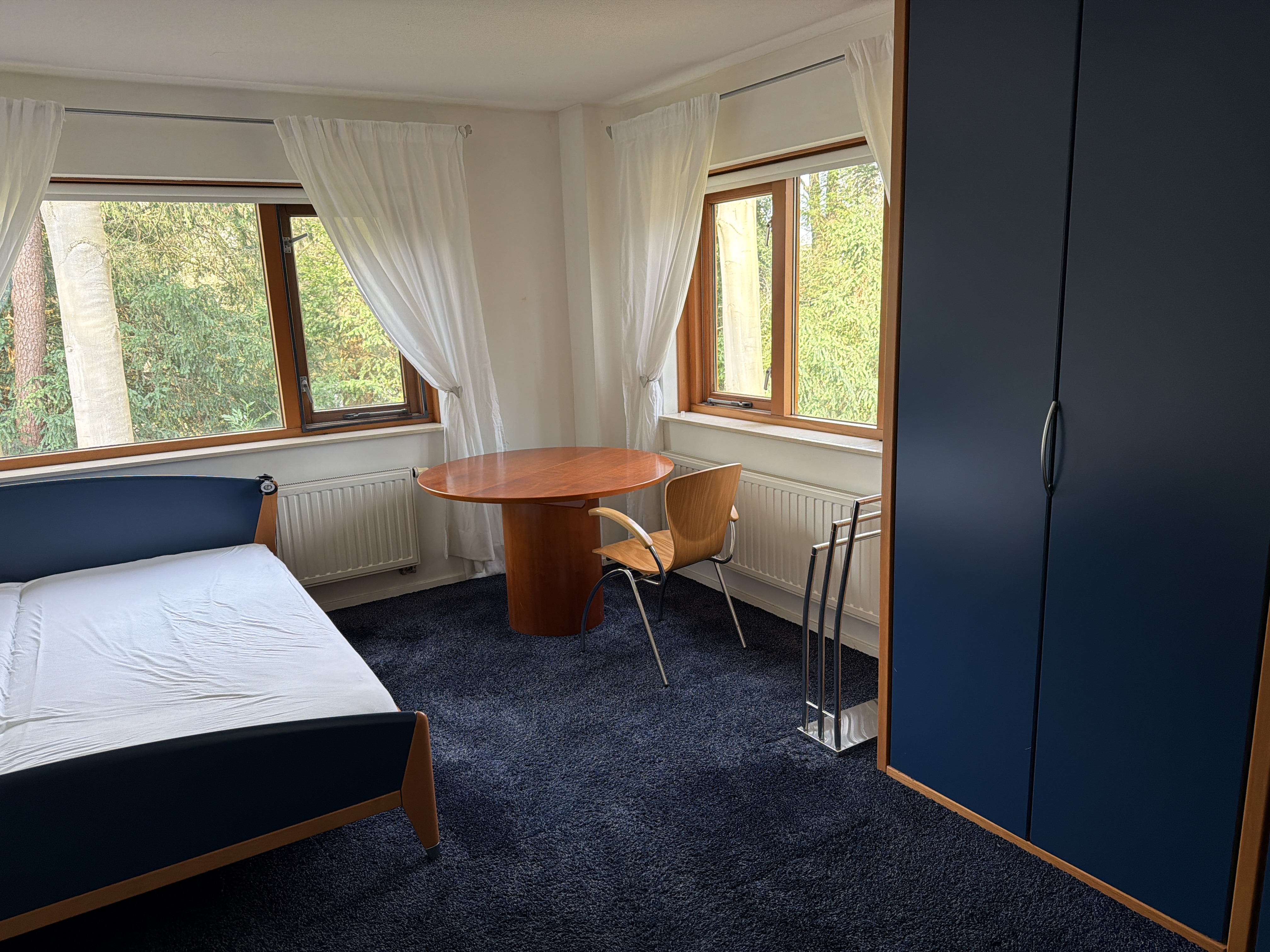 Mooie modern gemeubileerde 20m2 kamer in een huis in een bosrijke omgeving. 12 min fietsen van universiteit. Kamer is op 1ste verdieping evenals de gedeelde badkamer en wc. Op de overloop is een kit...