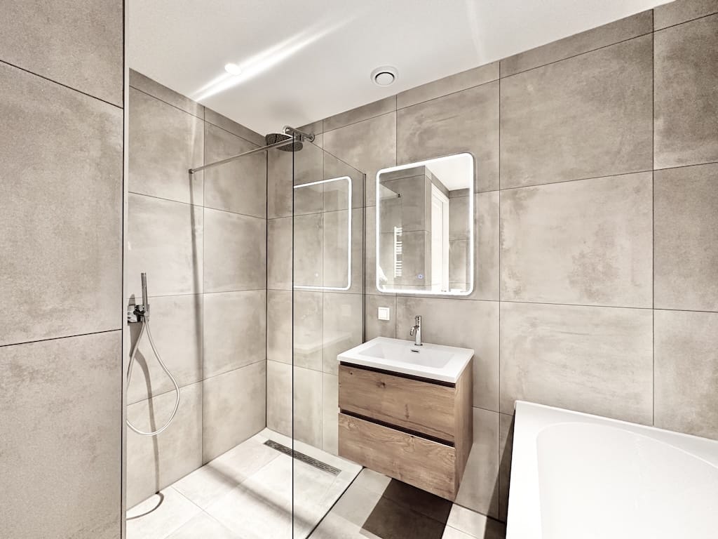 Double glazed windows Wooden floor Ceiling lights Floor heating Kitchen equipped with drawers and cabinets Integrated 4-ring induction stove Integrated extractor fan Integrated oven Integrated dishwas...