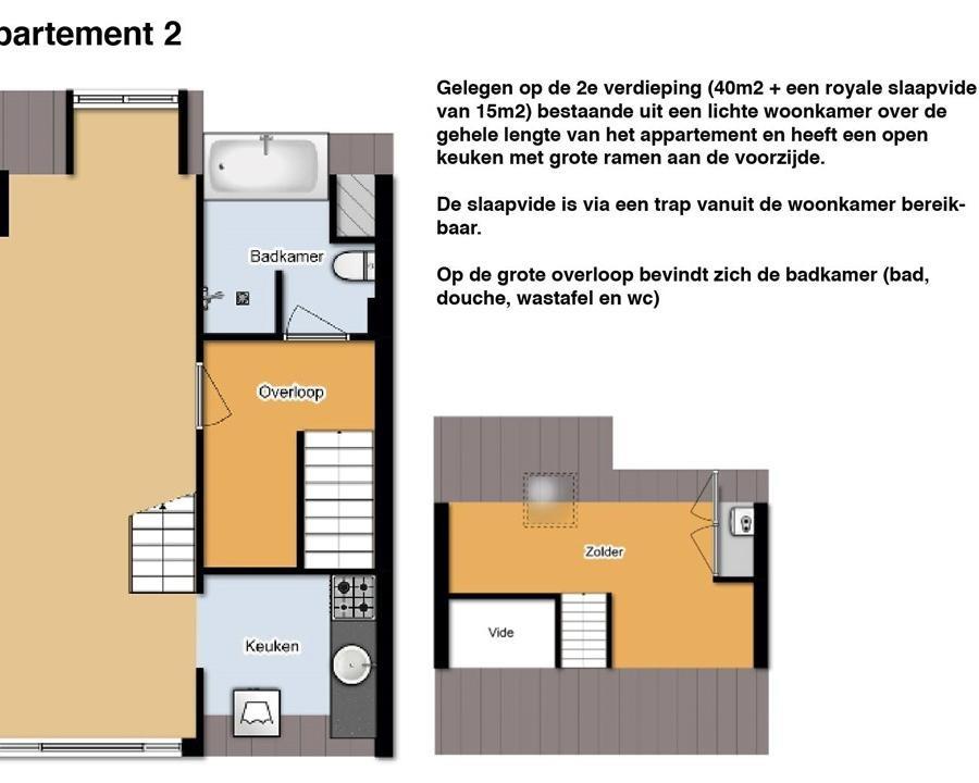 Gelegen op de 2e verdieping (40m2 + royale slaapvide 15m2) bestaande uit een lichte woonkamer over de gehele lengte van het appartement. Een open keuken met grote ramen aan de voorzijde. De slaapvid...