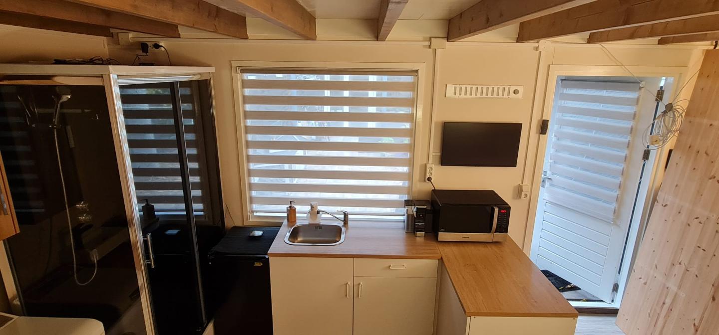 In de studio (16m2): • Eigen toegang tot studio • Opklapbed (met bureau) • Volledig ingerichte kitchenette • Moderne douchecabine • Wasmachine • Magnetron en koffiezetapparaat • Separaat eco-toilet • ...