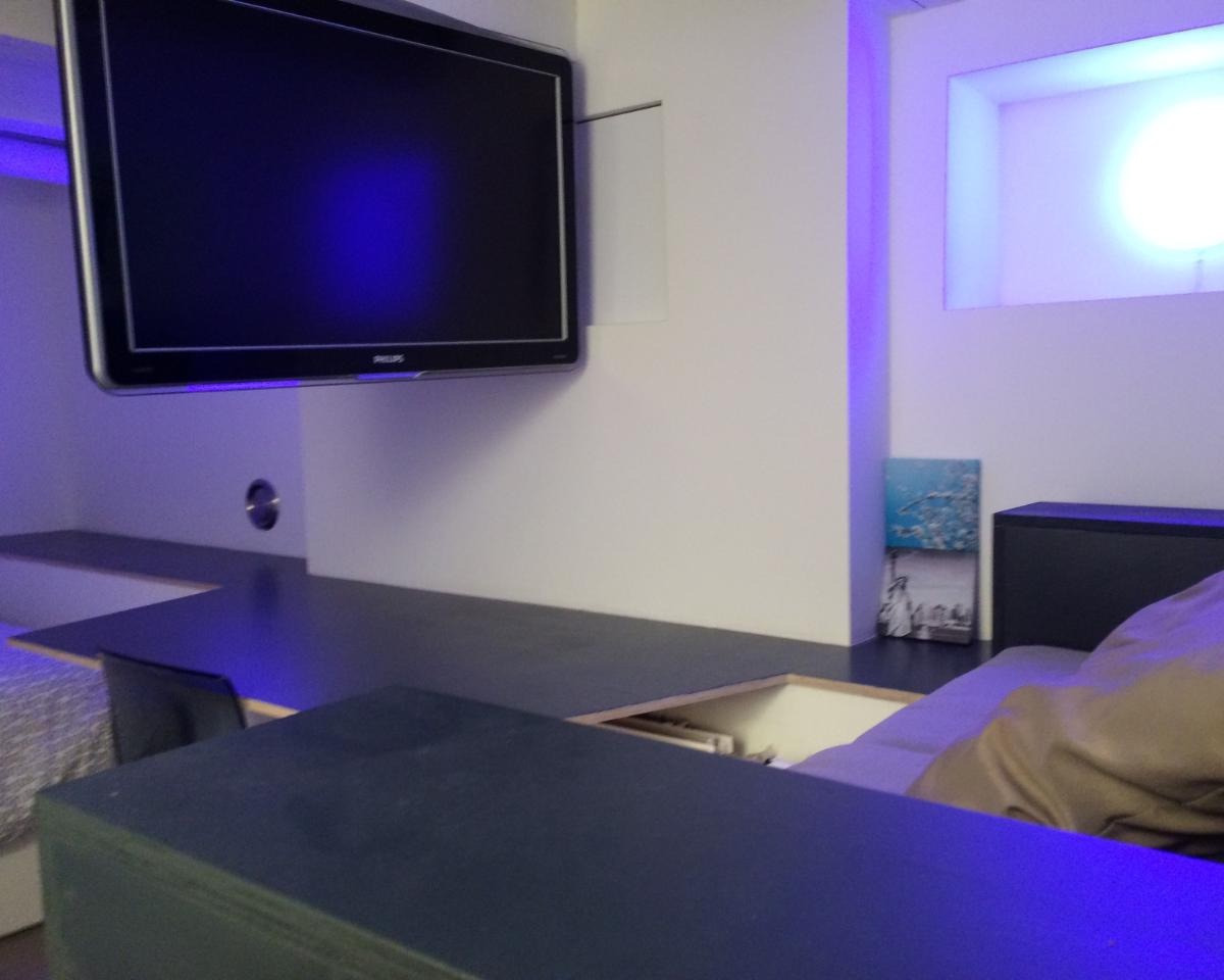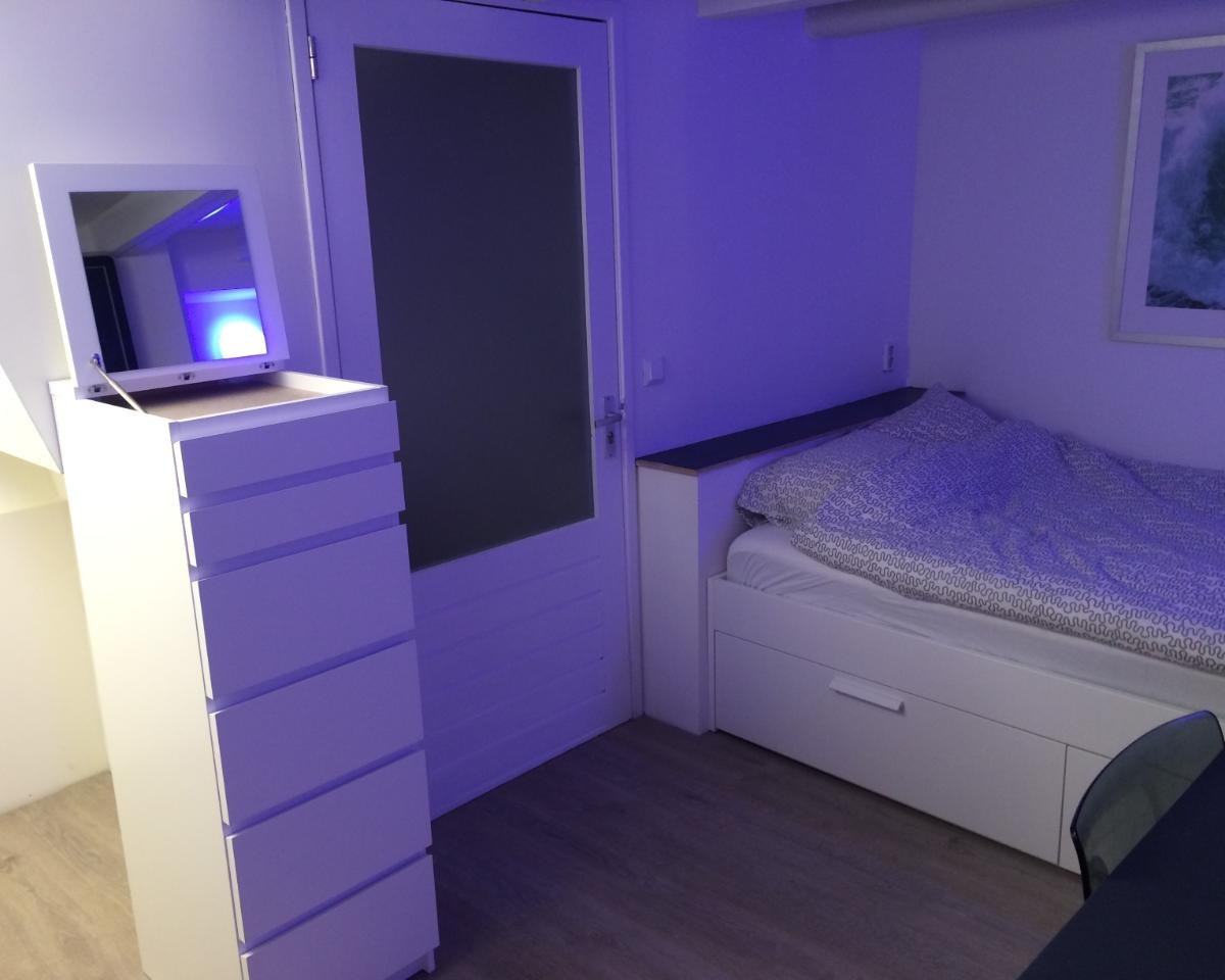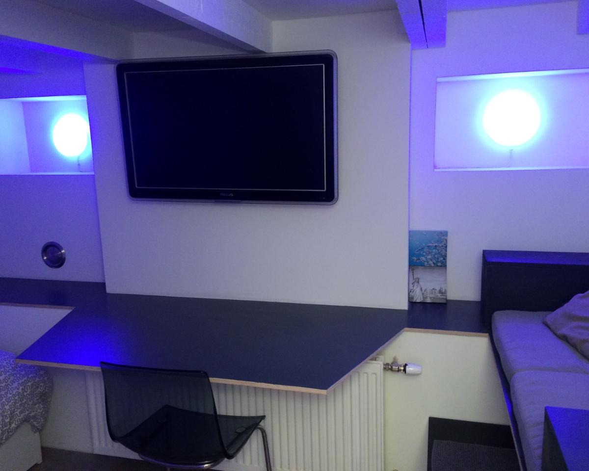 Deze souterrain kamer is volledig uitgerust. Tweepersoonsbed, grote flatscreen-tv beweegbaar in alle richtingen, ruime opbergmogelijkheden, een zithoek en een ruim bureau. Er is daglicht, goede luchtt...