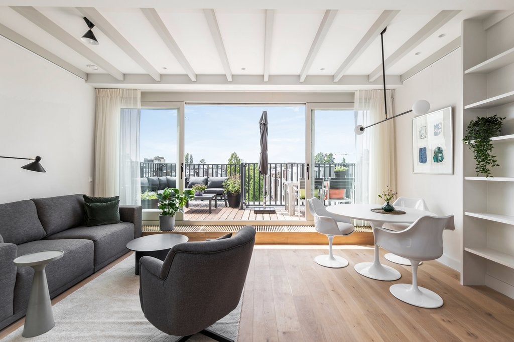 Beschrijving Fantastisch volledig gemeubileerd 2 slaapkamer appartement met lift direct in woning van ca. 65 m2, met 2 dakterrassen! Wauw! Dit appartement is gelegen op de vierde en bovenste etage...
