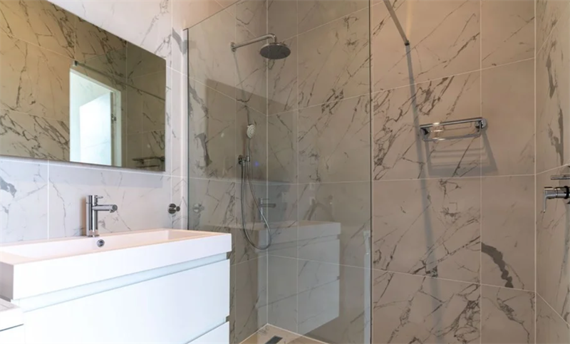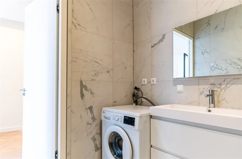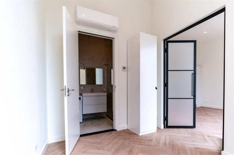 Er is een aparte slaapkamer aanwezig met een aangrenzende badkamer. De strakke badkamer is volledig ingericht met een inloopdouche, een wastafel met spiegel en een was-droogcombinatie. Een apart toile...