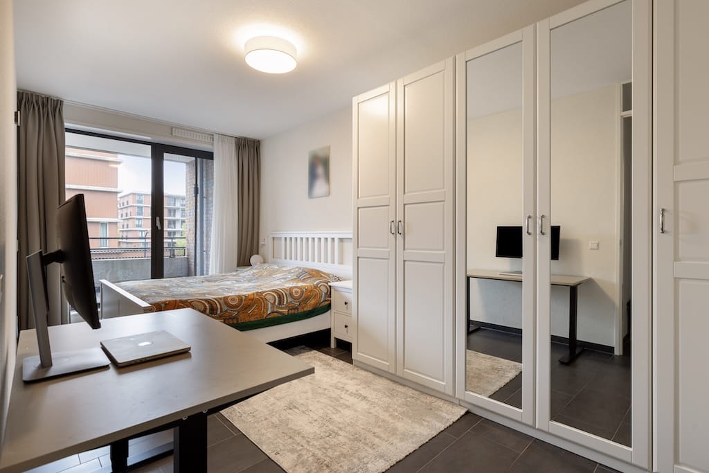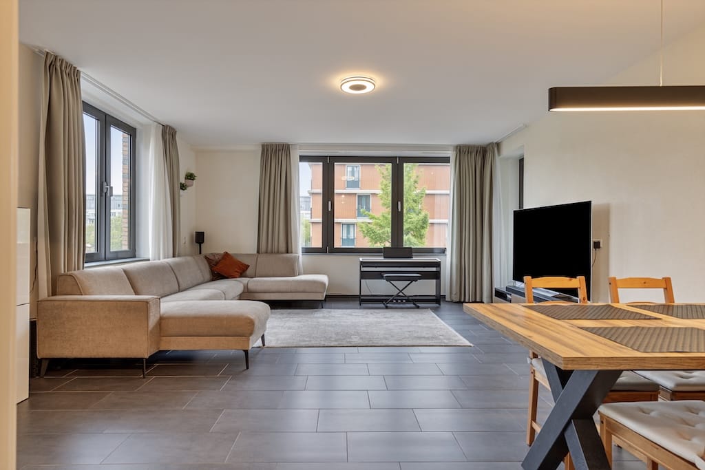 Double-glazed window Tiled floor Floor heating Ceiling lights Curtains Cabinet Kitchen equipped with drawers and cabinets Integrated 4 ring induction stove Integrated extractor fan Integrated oven- mi...