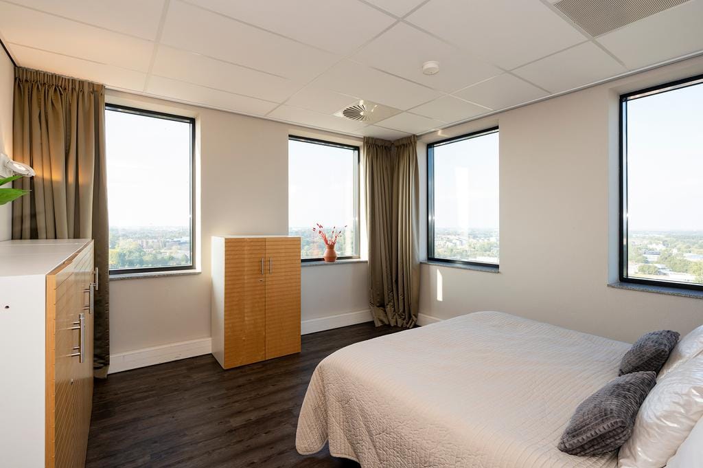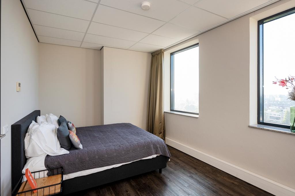 SHORT STAY | 3 TOT 6 MAANDEN Volledig gemeubileerd en gestoffeerd 3-kamer appartement in de Eschertoren Leiden. Gelegen op de 13e etage. Instapklaar en geschikt voor tijdelijk verblijf. FINANCIEEL (al...