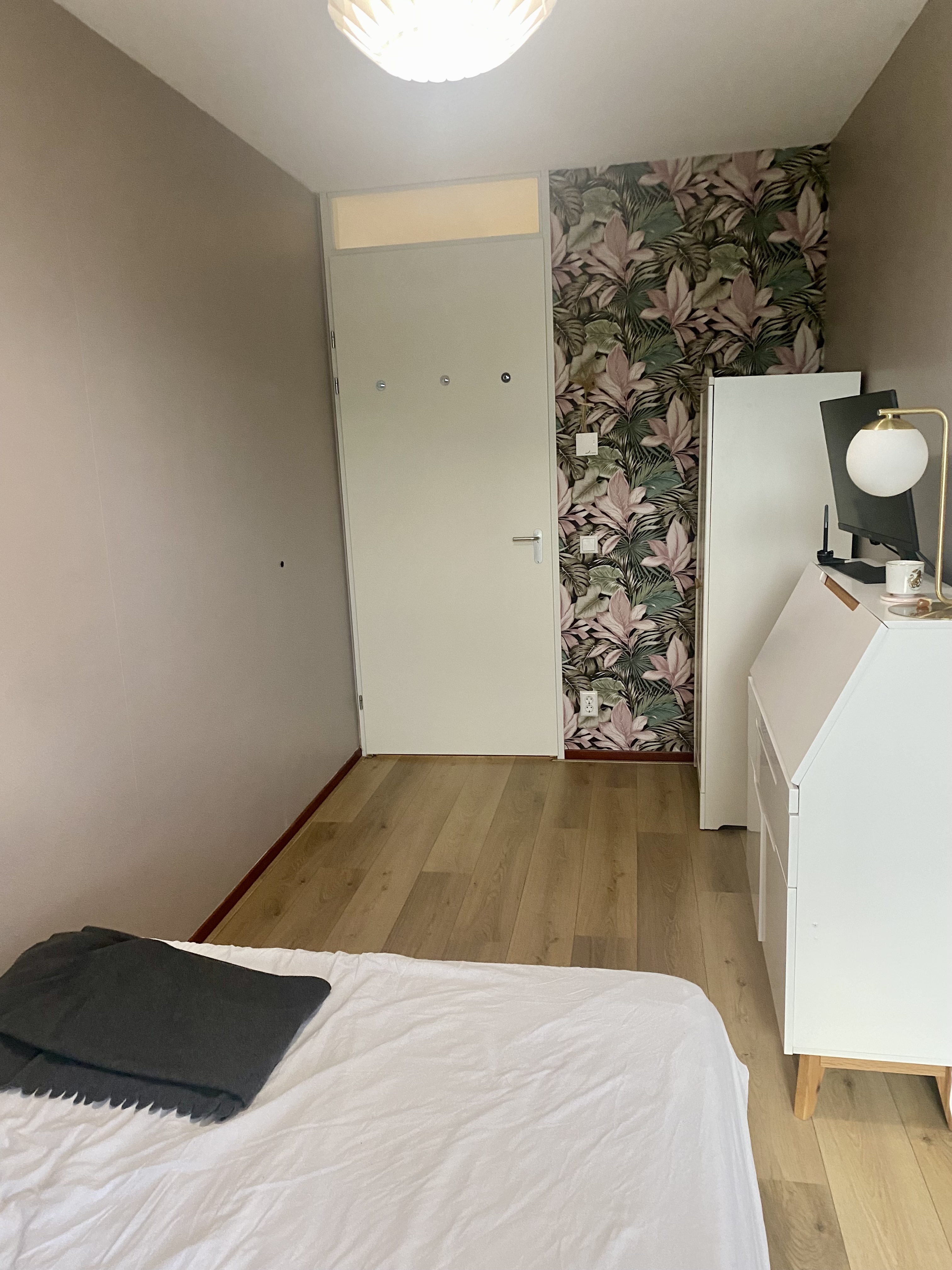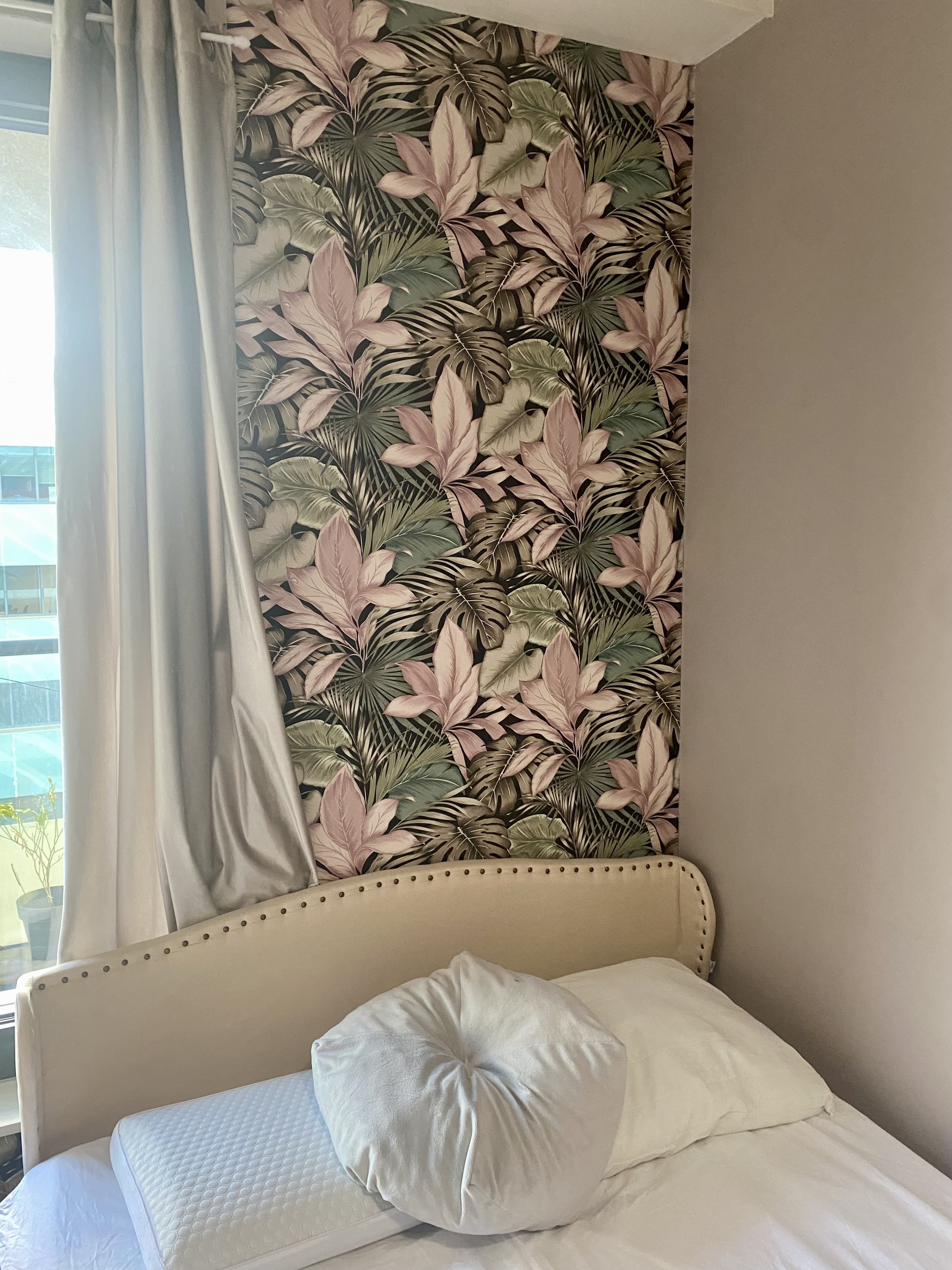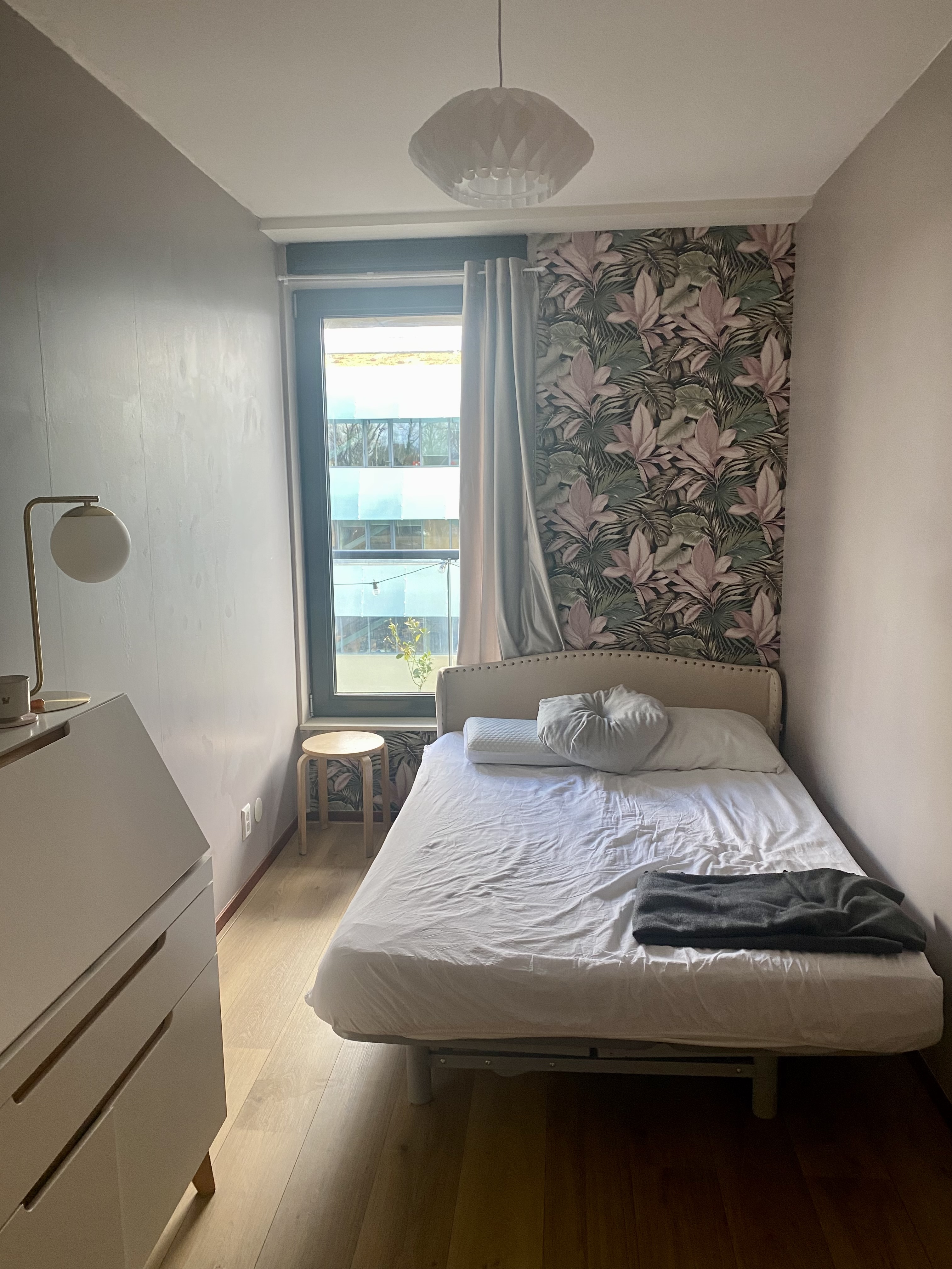 Private room with balcony access in modern tower building. Newly painted and wallpapered. Fully furnished w/ Bed, curtains, wardrobe, end table. Secretary desk shown in photos avail to purchase. Shar...