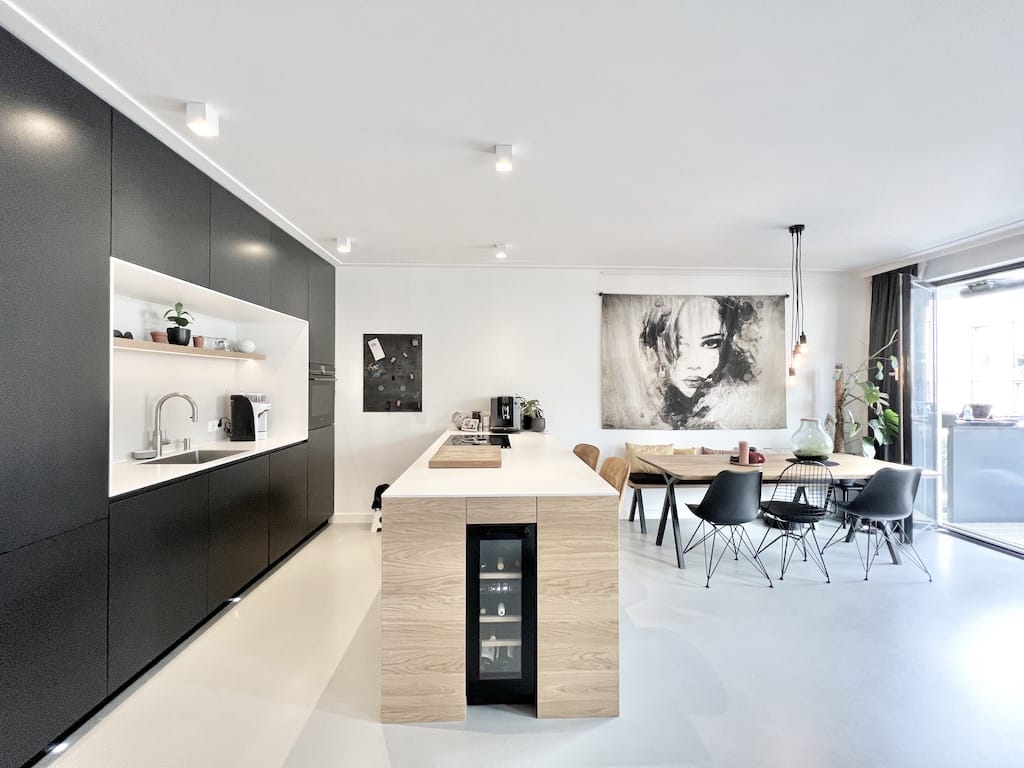 Concrete floor Ceiling lights Curtains Floor lamp Sofa Coffee table The kitchen is fully equipped with drawers and cabinets Integrated 4 ring induction stove Integrated extractor fan Integrated oven I...